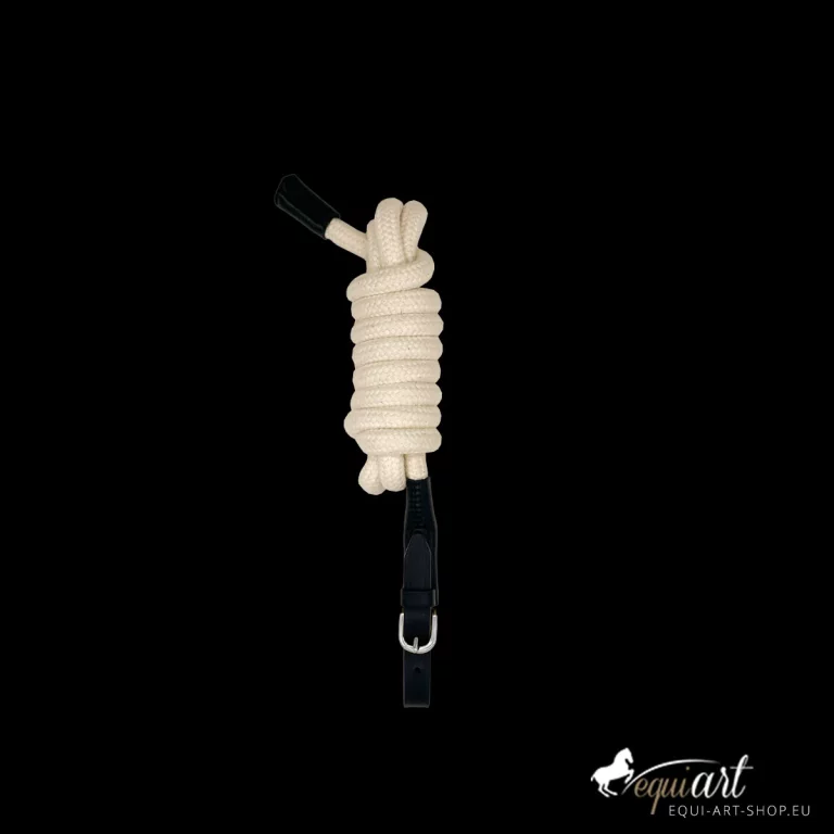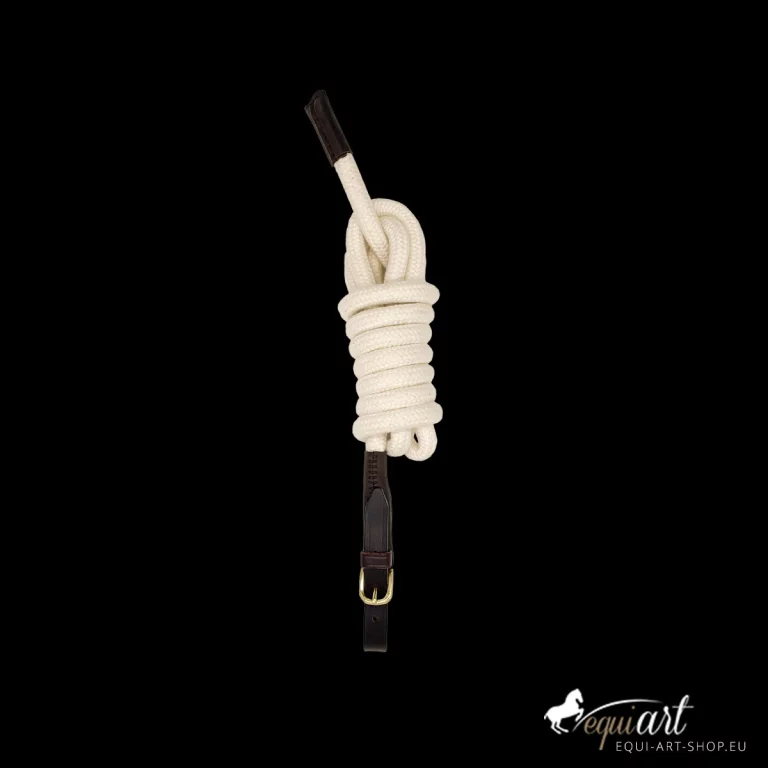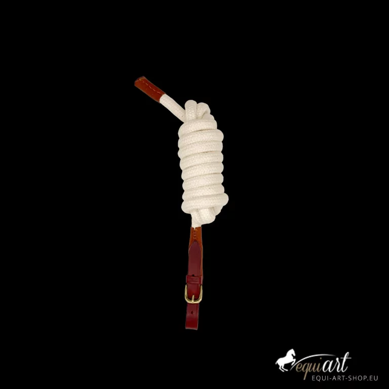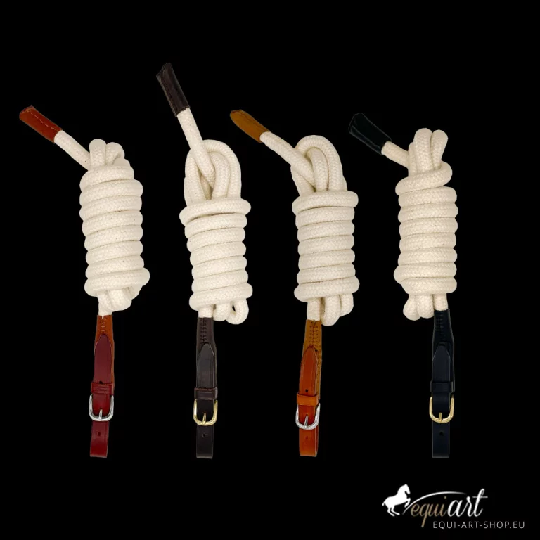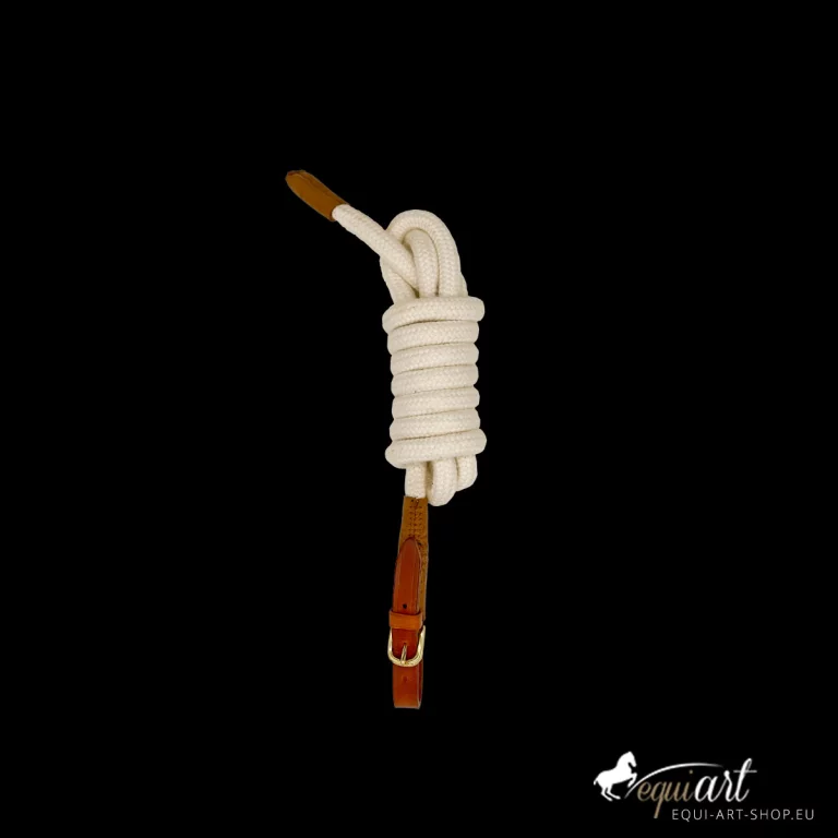 Bodenarbeitsseil 2,5 m mit Lederschlaufe Das kurze, offene, portugiesische Bodenarbeitsseil ist 2,5 Meter lang und ist ideal für die Arbeit am Boden, nah am Pferd, geeignet . Das Seil hat einen Durchmesser von ca. 1,5 cm. Die stabile Lederschlaufe ermöglicht eine feine Kommunikation und unterstützt eine ruhige Führung am Kappzaum. Die Seile sind handgefertigt aus reiner Baumwolle mit sehr schönen Lederapplikationen (schwarz-, braun-, havanna-, oder cognacfarben) und liegen optimal in der Hand. Gewicht und Stärke des Seils sind so ausgelegt, dass sie feinste Einwirkung auf das Pferd ermöglichen, ohne zu ermüden. Jeder, der einmal eines dieser wunderbar handschmeichelnden Seile in der Hand gehabt hat, ist von der Qualität des Materials restlos überzeugt.