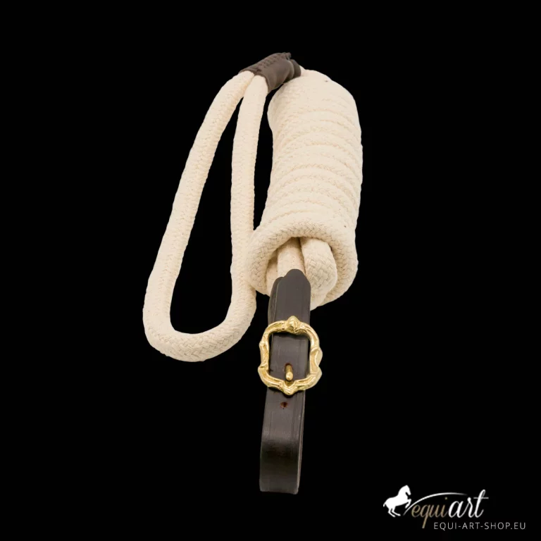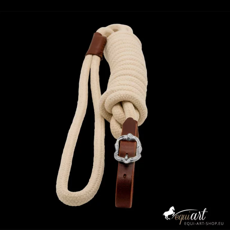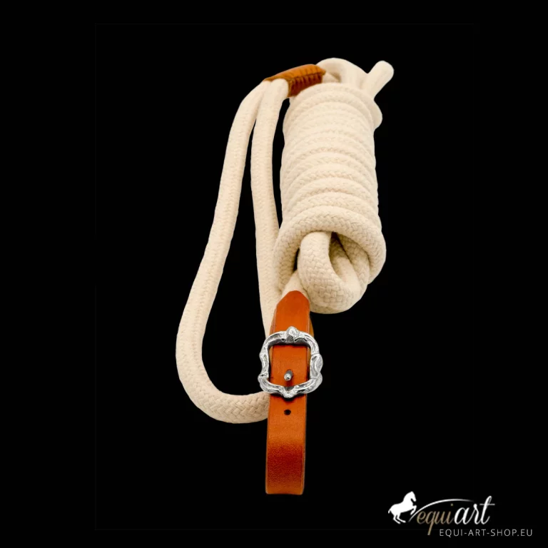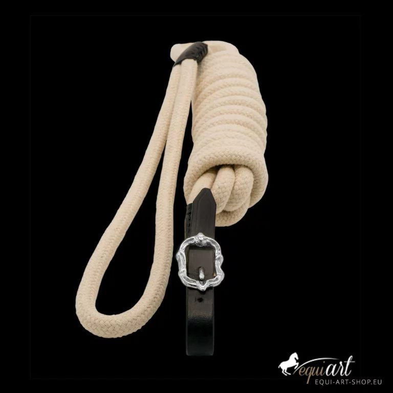 Das Besondere bei diesem Bodenarbeitsseil ist die stabile Lederschlaufe mit barocker Schnalle, die am Kappzaum befestigt wird. Durch das geringe Gewicht und die ruhige Lage, eignet sich dieses Seil insbesondere für am Kopf empfindliche Pferde. In der Bodenarbeit, auf Nähe und leichte Distanz, ist feinste Einwirkung möglich.