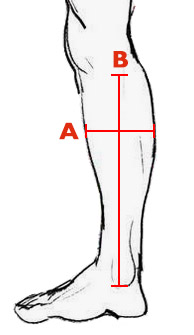Die Weite (A) wird an der dicksten Stelle der Wade gemessen, die Länge (B) von der Achillesferse (in etwa Höhe der Knöchel) bis unterhalb der Kniekehle.