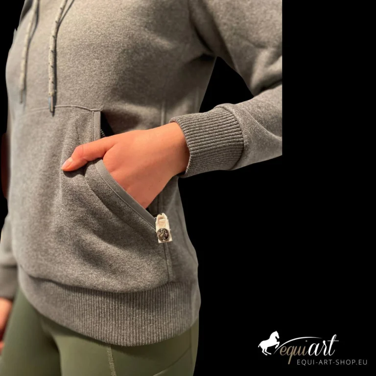 Der equi-art Hoodie überzeugt durch funktionelle Details wie eine sichere Kanguru-Tasche mit Reißverschluss und eine befestigbare Kapuze, die beim Reiten nicht stört. Die perfekte Passform und der schöne Bund sorgen für maximalen Komfort.