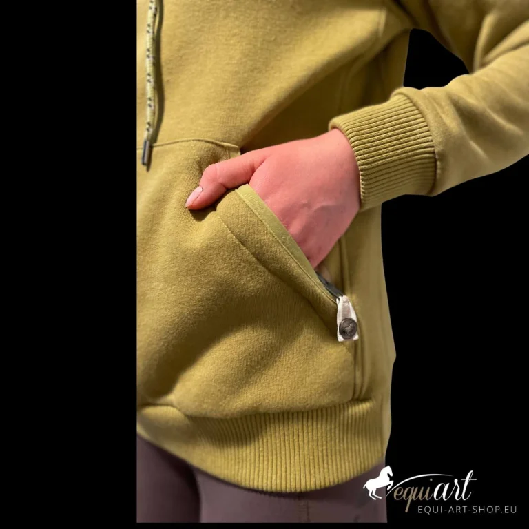 Der equi-art Hoodie überzeugt durch funktionelle Details wie eine sichere Kanguru-Tasche mit Reißverschluss und eine befestigbare Kapuze, die beim Reiten nicht stört. Die perfekte Passform und der schöne Bund sorgen für maximalen Komfort.