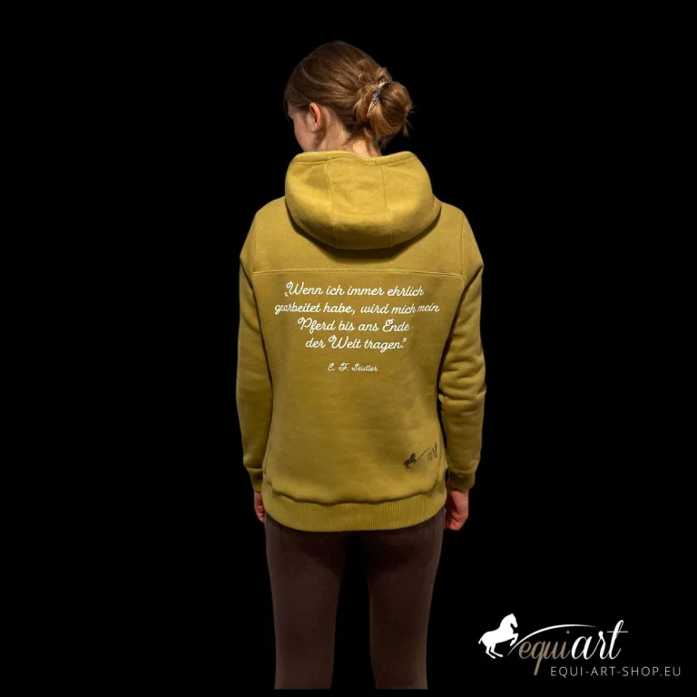 Dieser Hoodie ist mehr als nur ein Kleidungsstück – er ist ein Statement für alle passionierten Reiterinnen und Reiter mit einem inspirierenden Zitat von Reitmeister E.F. Seidler.