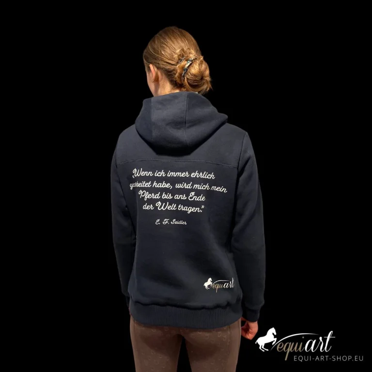 Dieser Hoodie ist mehr als nur ein Kleidungsstück – er ist ein Statement für alle passionierten Reiterinnen und Reiter mit einem inspirierenden Zitat von Reitmeister E.F. Seidler.
