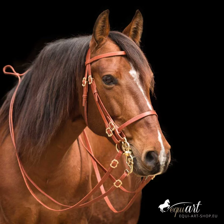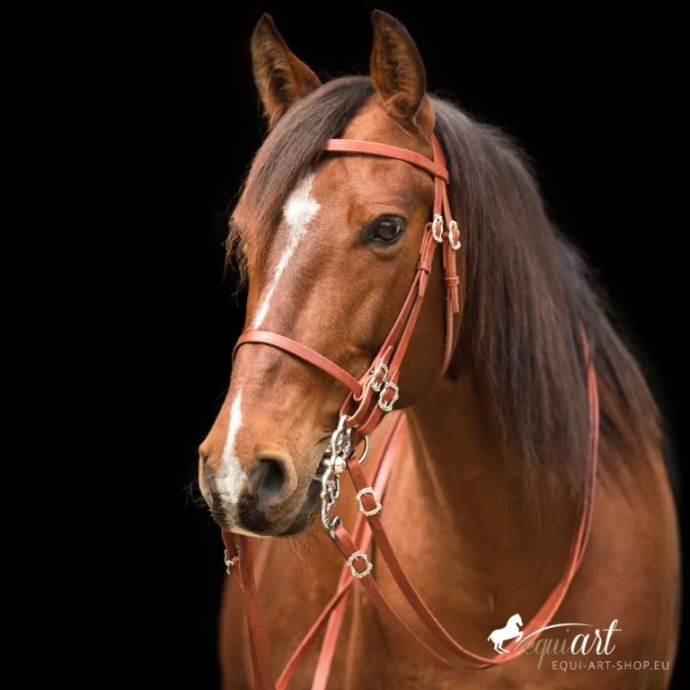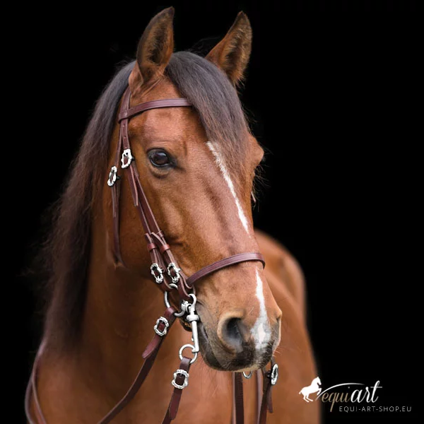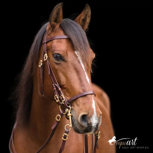 Der dezente klassisch-portugiesische Kandarenzaum Aveira wirkt durch die schmalen Riemen (15 mm), trotz Schmuckschnallen, sehr elegant und edel und ist auch für kleinere Pferdeköpfe geeignet.