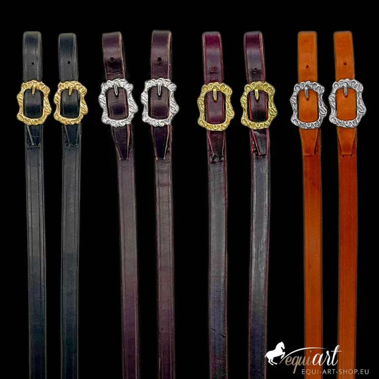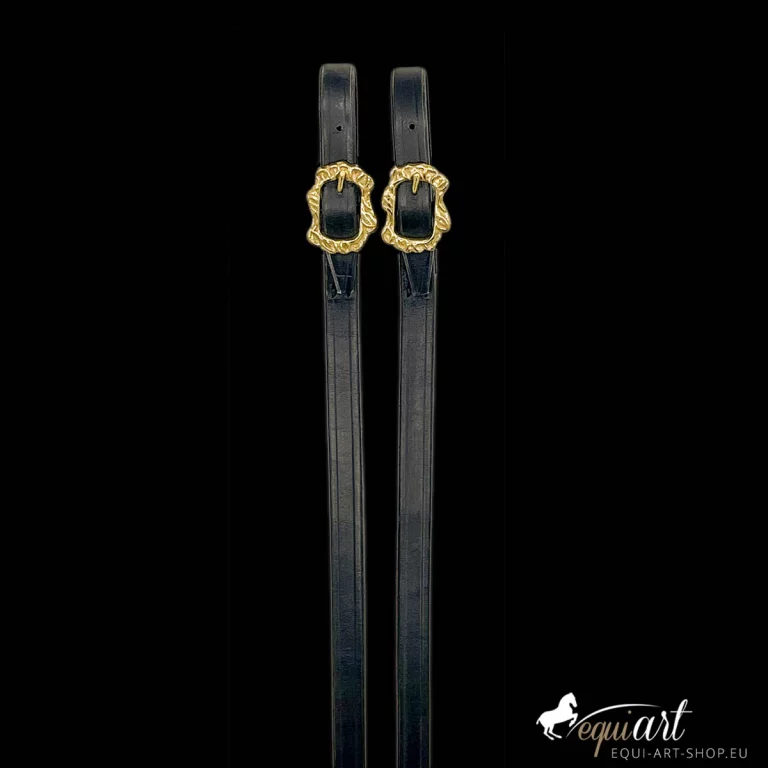 Kandarenzügel Aveiro Die Zügel aus weichem Leder haben eine Gesamtlänge von 2,9 m. Sie sind in schwarz, braun, havanna und cognac erhältlich. Die barocken Cortesia-Schnallen können wahlweise in silber oder messing sein.