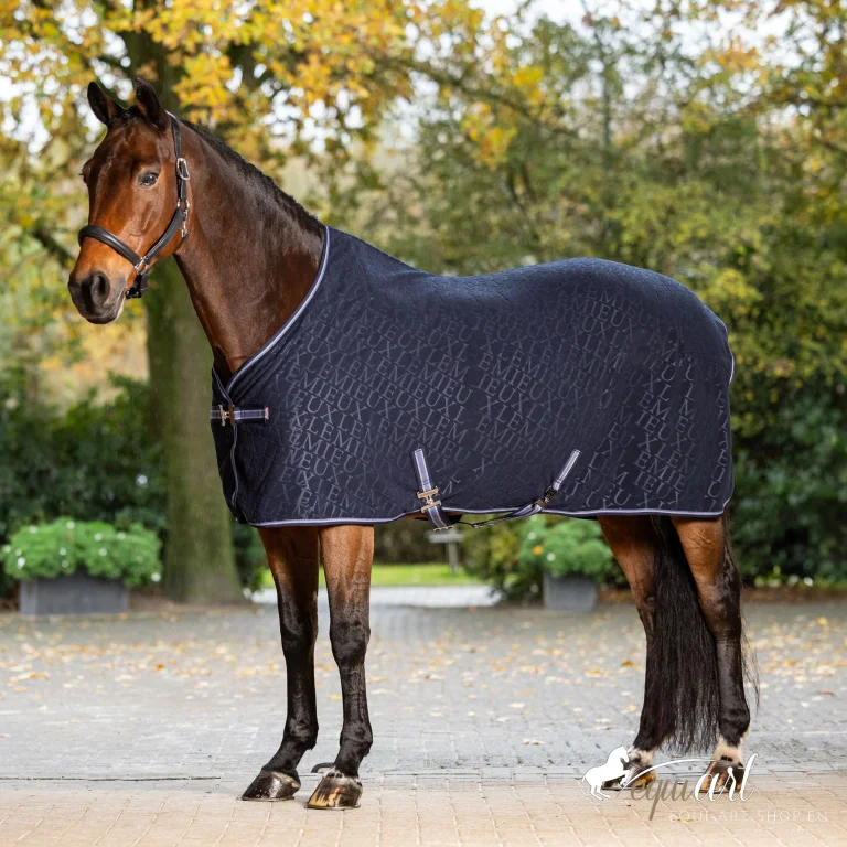 Abschwitzdecke aus weichem Anti-Pilling-Fleece mit antistatischem Schulterfutter, sicherem T-Verschluss, Kreuzgurten und geprägtem LeMieux Branding – funktional und vielseitig einsetzbar