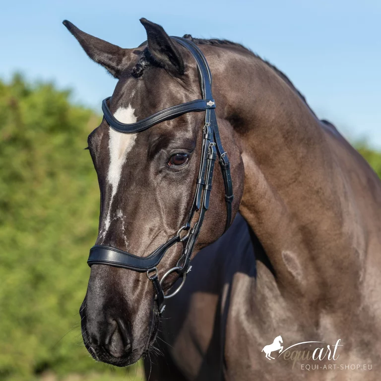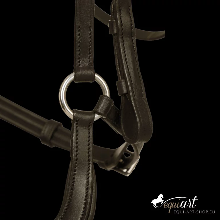 Diese Trense verfügt über ein anatomisch geformtes Stirnband, ein gepolstertes Genickstück und einen Nasenriemen, der so gestaltet ist, dass er sanft anliegt, ohne Druck auf empfindliche Bereiche auszuüben. Der D-Ring verbindet Nasenriemen und Backenstücke optimal und sorgt dafür, dass sie angenehm auf der Haut des Pferdes aufliegen.