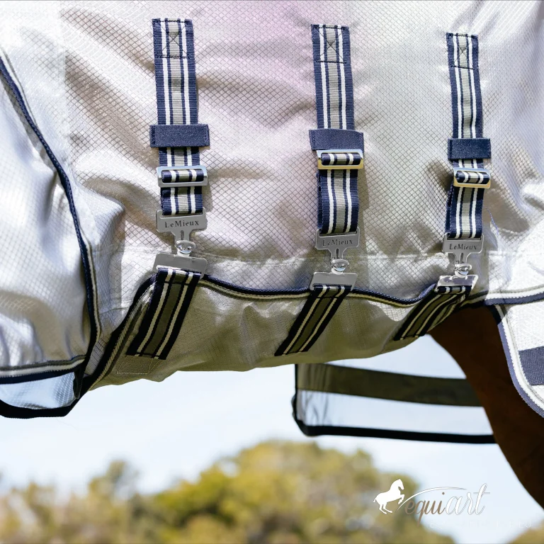 Speziell konzipiert mit einer extra großen Bauchklappe mit drei Verschlüssen, bietet die Decke umfassenden Schutz für den empfindlichen Bauchbereich und garantiert einen sicheren Sitz ohne Verrutschen. Der tiefe und lange Schweifschnitt schützt ebenfalls Schweif und Hinterbeine Ihres Pferdes.