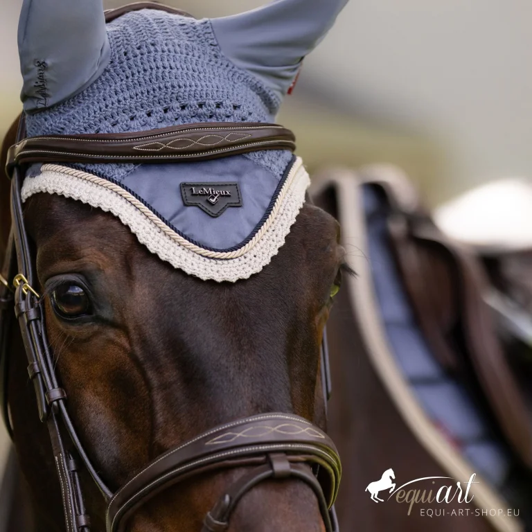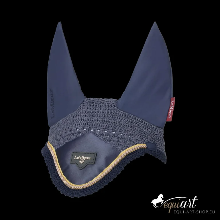 Mit dem charakteristischen LeMieux Loire in Dusk Blue geprägten Metallmotiv wird diese luxuriöse Fliegenhaube zu einem echten Blickfang. Sie ist aus handgestricktem Drei-Wege-Häkelstoff gefertigt und kombiniert diesen mit hochwertigem Satin-Stoff an der Front, wodurch ein ansprechendes Design entsteht. Die weichen Stretch-Elasthan-Ohren bieten nicht nur optimalen Komfort, sondern auch einen perfekten Sitz, damit Ihr Pferd während des Reitens oder bei der Bodenarbeit bestens geschützt ist.
