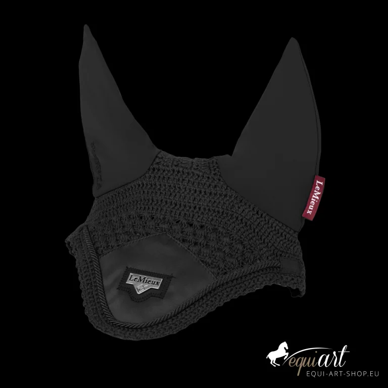 Die LeMieux Loire Fliegenhaube kombiniert stilvolles Design mit hervorragender Funktionalität. Hergestellt aus handgestricktem Drei-Wege-Häkelstoff und luxuriösem Satin, besitzt sie ein charakteristisches Metallmotiv und weiche Stretch-Elasthan-Ohren für optimalen Komfort.