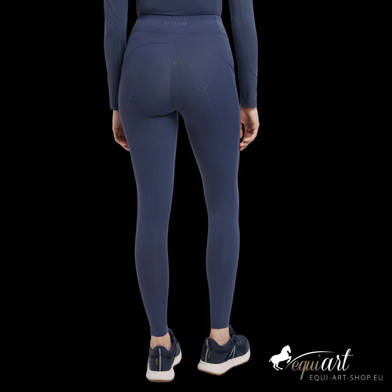 Die LeMieux Reitleggings Naomi in der Farbe Dusk Blue bieten Ihnen höchsten Komfort durch ihr nahtloses, elastisches Material und den stützenden Gummibund.