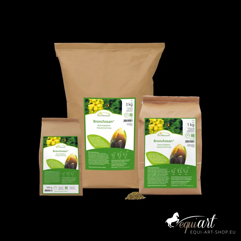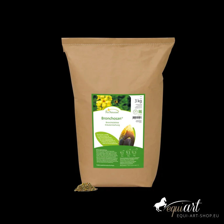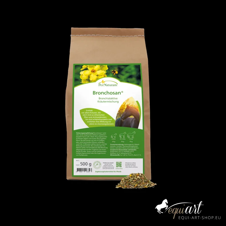 Bronchosan-Kräuter sind reich an ätherischen Ölen und Antioxidantien, die speziell auf die Schleimhäute der Atemwege wirken. Diese aromatische Mischung unterstützt die Schleimlösung und macht das Abhusten für das Pferd erleichtert. Mit Pernaturam Bronchosan pflegen und stärken Sie die Atemwege Ihres Pferdes auf natürliche Weise.