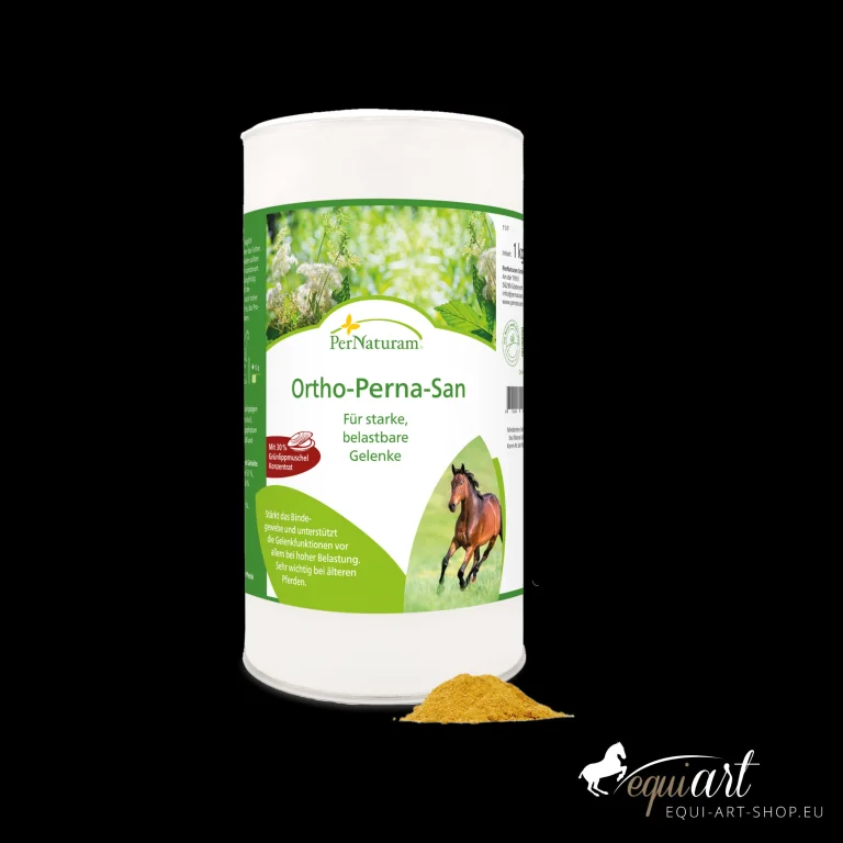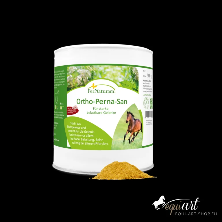 Pernaturam Ortho-Perna-San ist die ideale Ergänzung zur Förderung starker und belastbarer Gelenke bei Ihrem Pferd. Dieses hochwertige Produkt stärkt das Bindegewebe und unterstützt die Gelenkfunktionen, insbesondere bei hoher Beanspruchung. Es ist besonders nützlich für ältere Pferde, die unter Gelenkschäden leiden. Wir empfehlen, Ortho-Perna-San täglich leicht angefeuchtet unter das Futter zu mischen. Ältere Pferde sollten Ortho-Perna-San langfristig zwei- bis dreimal wöchentlich erhalten, am besten in Kombination mit Lecithin und Kieselerde. Zur Regeneration nach intensiver Belastung genügt die Fütterung über einen Zeitraum von 5 bis 7 Tagen.