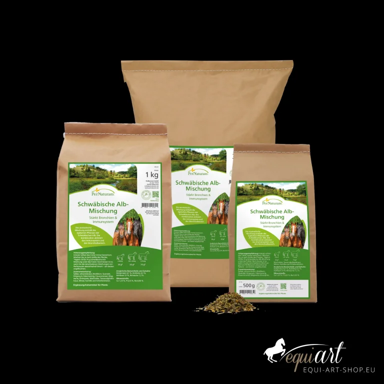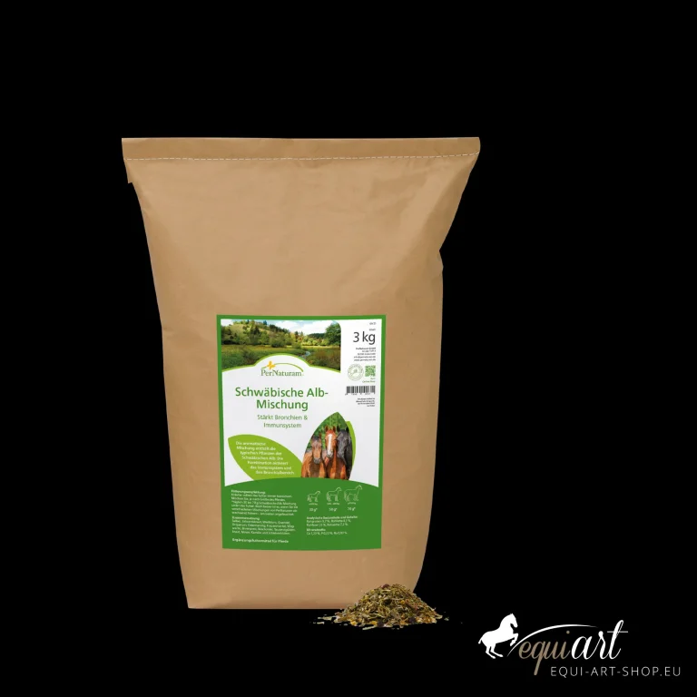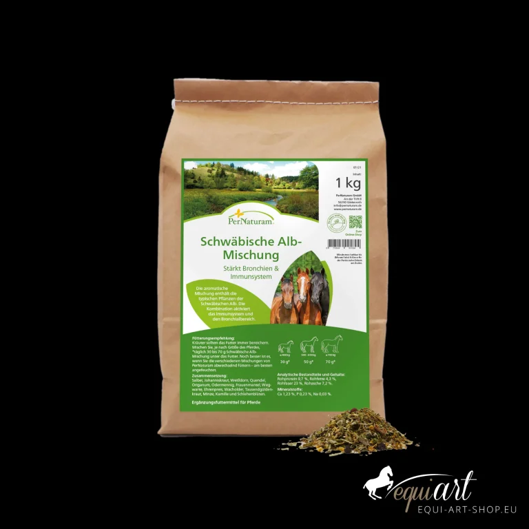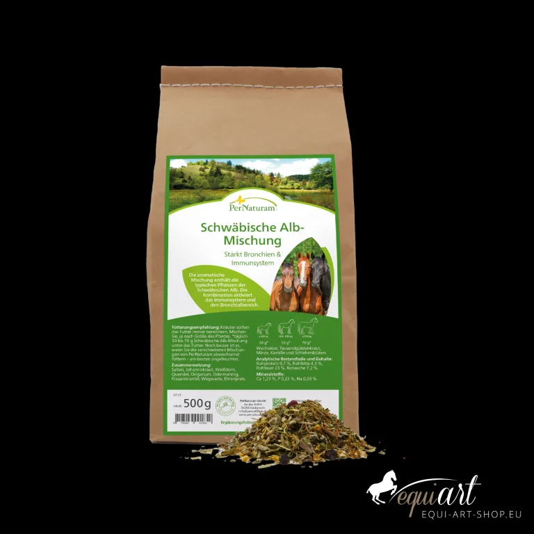 Die Pernaturam Schwäbische Alb-Mischung ist ein aromatischer Kräuter-Mix zur Stärkung der Bronchien und des Immunsystems Ihres Pferdes. Sie enthält robuste Pflanzen der Kalkmagerrasen und Wacholderheiden der Schwäbischen Alb und bietet eine artgerechte Ergänzung, besonders für südliche Pferderassen.