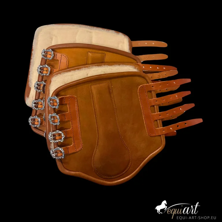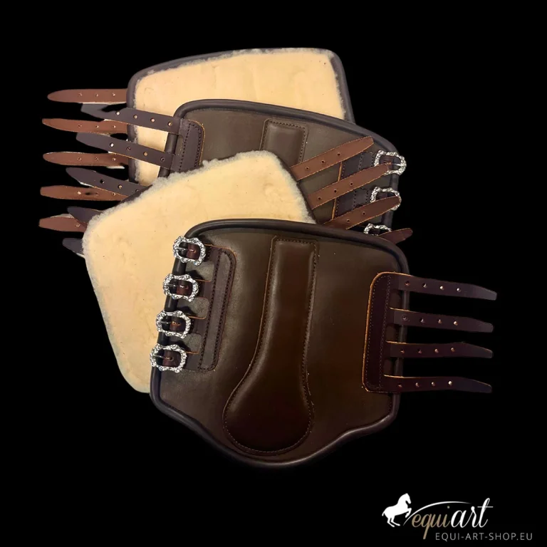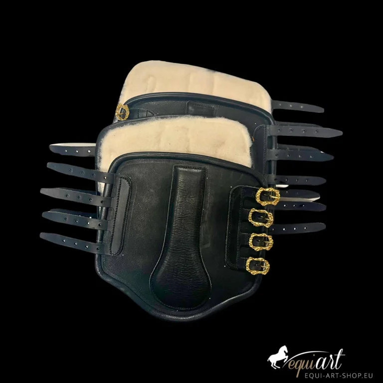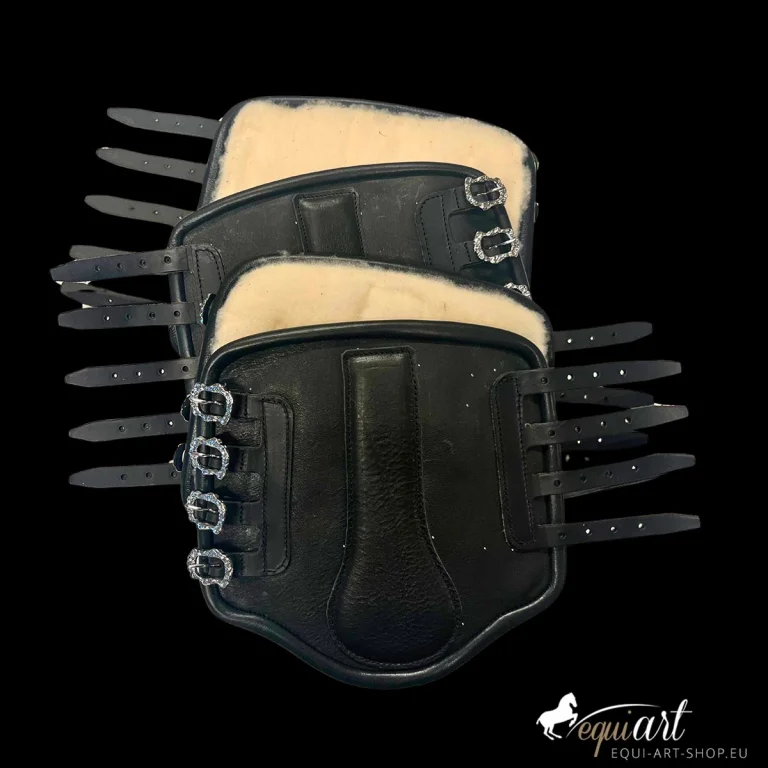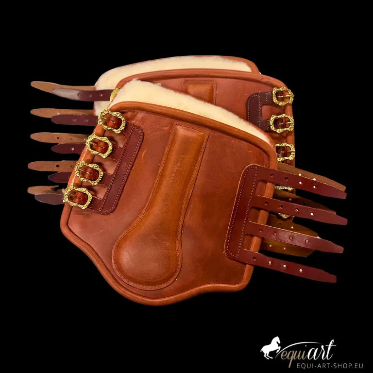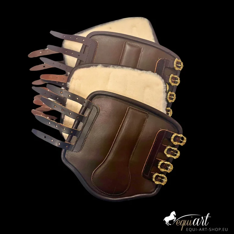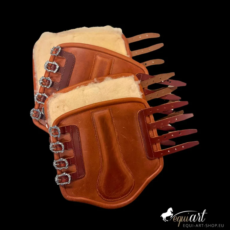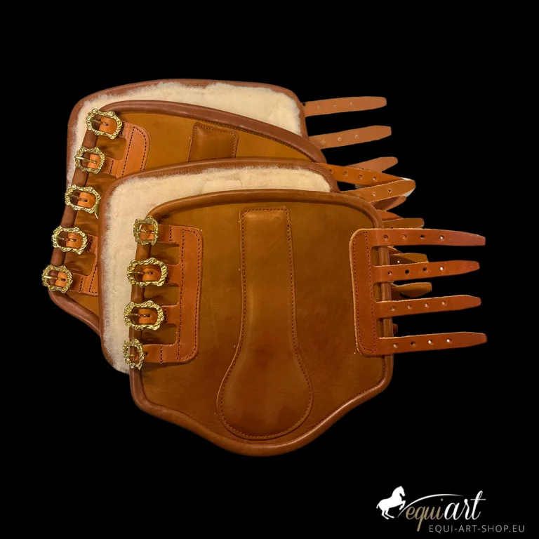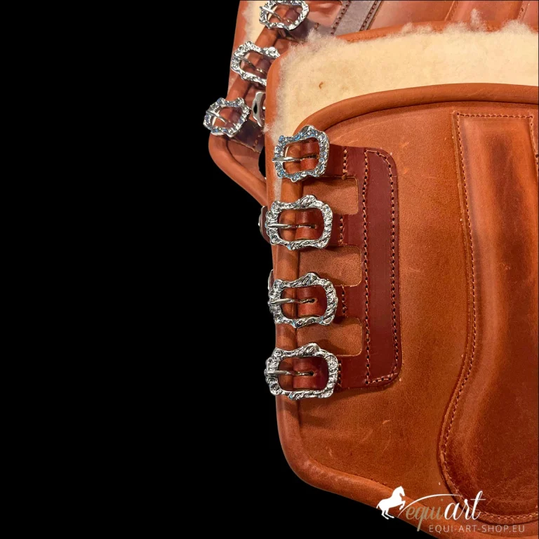 Traditionelle portugiesische Gamaschen mit Cortesia Schnallen in silber oder messing zum Schutz der empfindlichen Pferdebeine. Sehr gute Anpassung durch die kleinen Schnallen individuell möglich. Damit wird der Druck auf Sehnen oder Blutgefässe minimiert. Die Gamaschen sind mit Lammfell gefüttert, welches sich perfekt dem Pferdebein anpasst und guten Tragekomfort bietet. Scheuerstellen und Druckpunkte werden durch das weiche Innenleben der Gamaschen vermieden. Die robuste Lederaussenseite ist stoßabweisend und bietet sehr stabilen Schutz. Abgesehen von der hohen Funktionalität und dem optimalen Schutz für die Pferdebeine, sind die Gamschen natürlich auch ein edles, schmuckes Zubehör, welches in den Farben schwarz, braun, havanna oder cognac entsprechend passend zur Sattel- und Zaumzeugfarbe bestellt werden kann.