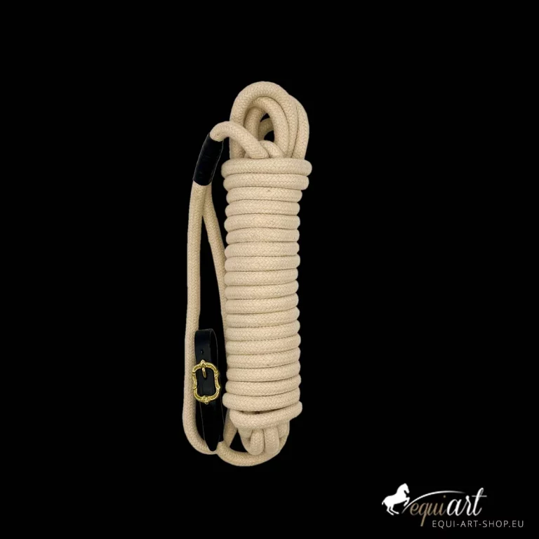 Diese handgefertigte cremefarbene Longe ist aus Baumwolle und liegt sehr gut und vor allem nicht zu schwer in der Hand. Das Material ist so verarbeitet, dass die Seile extrem weich sind. Sollte beim Longieren plötzlicher Zug auf die Hand kommen, so hinterlässt dieses Seil keine Abschürfungen an der Hand. Die cremefarbenen Seile sind mit schwarzem, havanna, cognacfarbenem oder dunkelbraunem Leder erhältlich. Das Seil hat einen Durchmesser von ca. 1,5 cm.