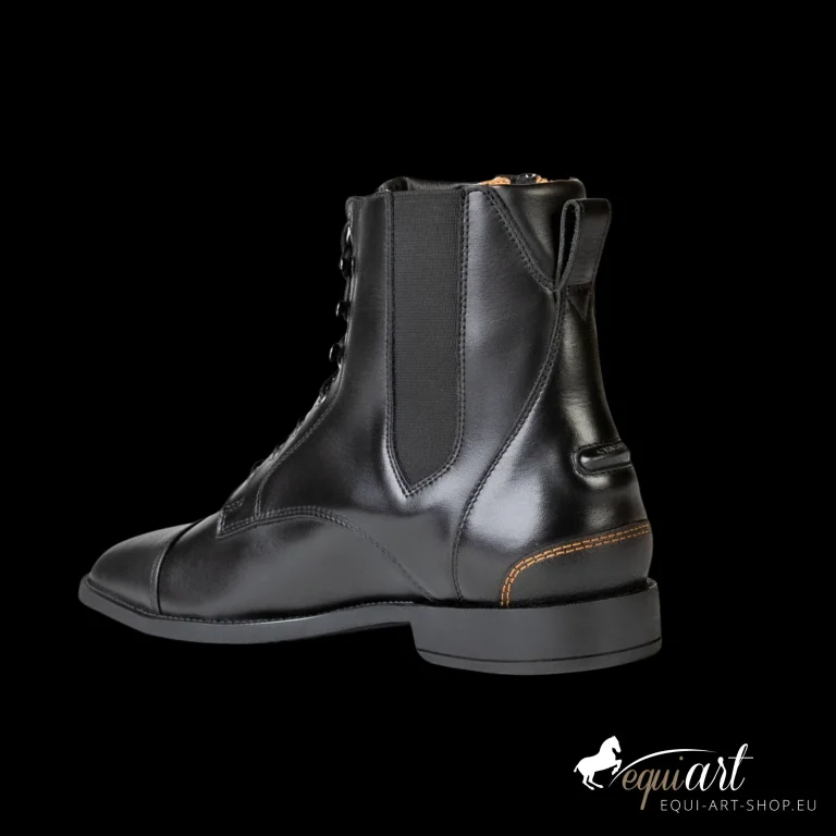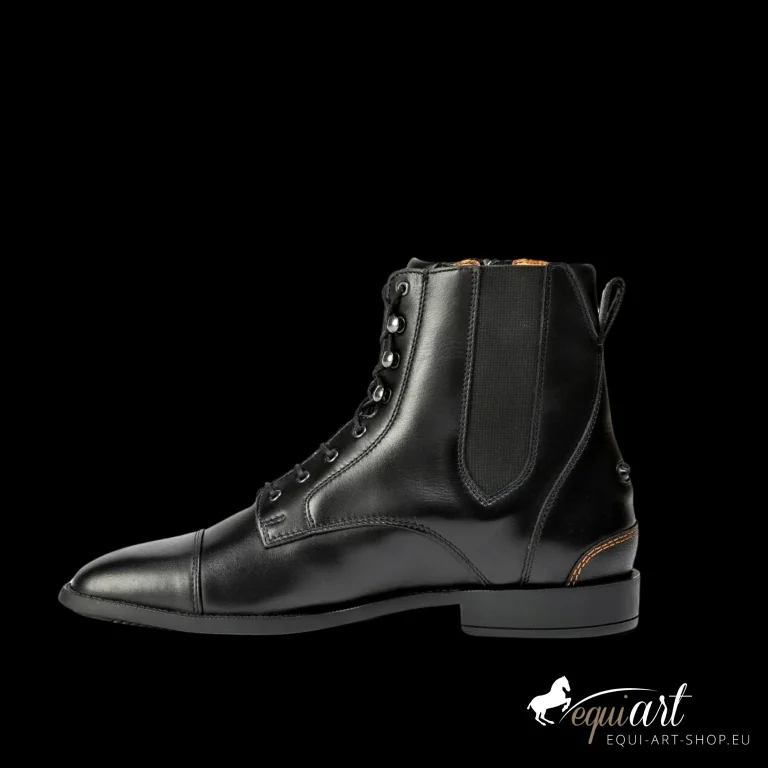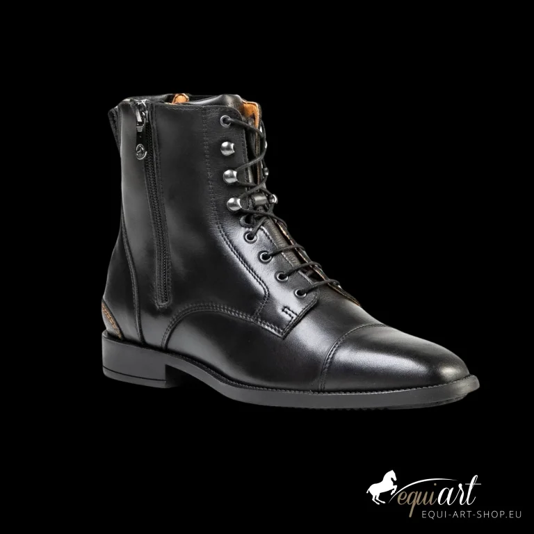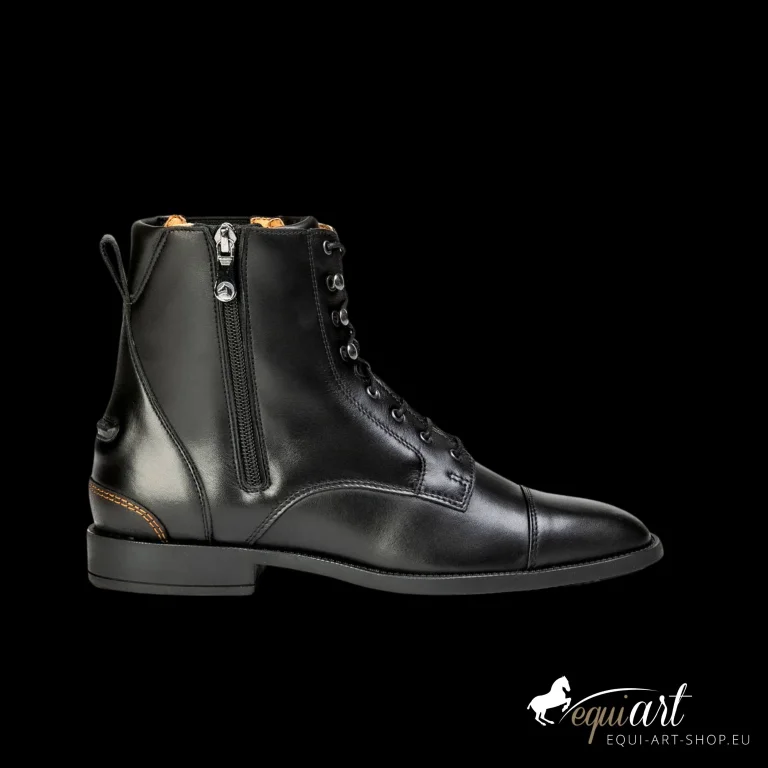 Die Reitstiefelette Dandy Soft von Chester überzeugt mit praktisch-komfortablem Design. Die schwarzen Stiefeletten aus hochwertigem Softleder verfügen über einen seitlichen Reißverschluss und Schnürsenkel, die den Einstieg erleichtern und gleichzeitig für einen sicheren Halt sorgen.