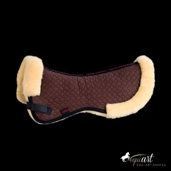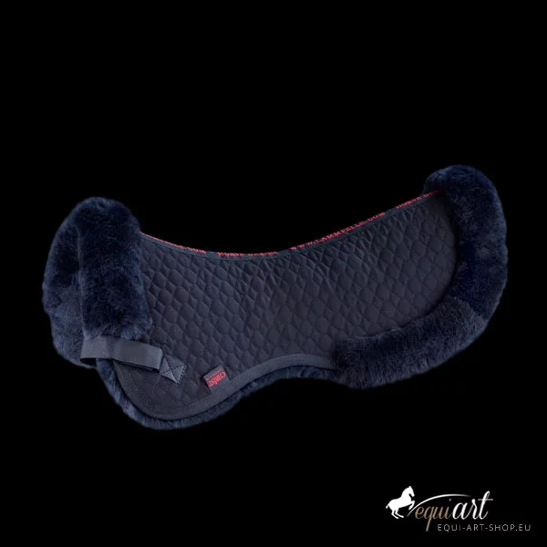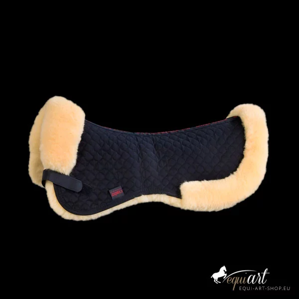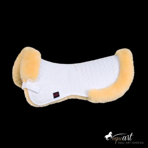 Das Pad ist mit echtem Lammfell an der Unterseite ausgestattet. Der Bereich des Wirbelkanals liegt frei. Die Oberseite besteht aus einem Spezial-Satteldeckenstoff. Befestigt wird es mittels Klettstrupfen an den Gurtriemen des Sattels. Vorne wird das Lammfell bis auf die Oberseite herumgezogen und dient als Sattelanlage. Der hintere Rand dient als zusätzlicher Kantenschutz und schmückt. Maschinenwaschbar mit einem Lammfellwaschmittel und trocknerbeständig.