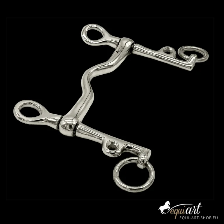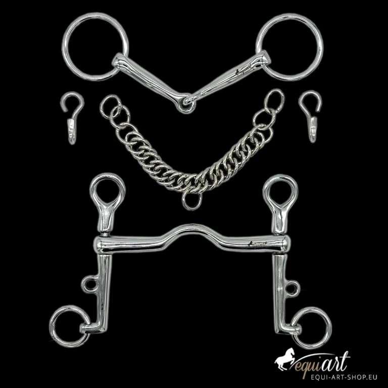 In diesem Set erhalten sind eine Pumpkandare mit 13 mm Stärke, eine Unterlegtrense mit 12 mm Stärke und eine Kinnkette inklusive Haken in silber.
