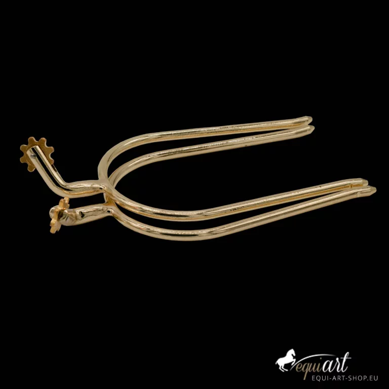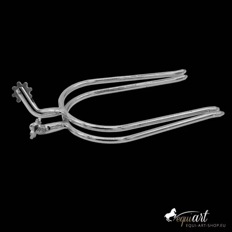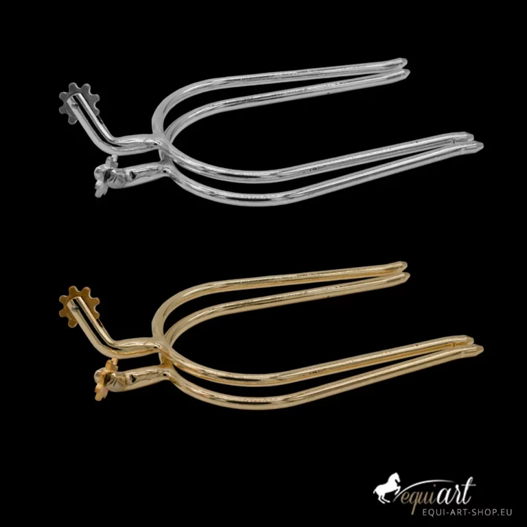 Portugiesische Stecksporen / Schwanenhalssporen aus Edelstahl mit gezacktem Rad in silber oder messing.