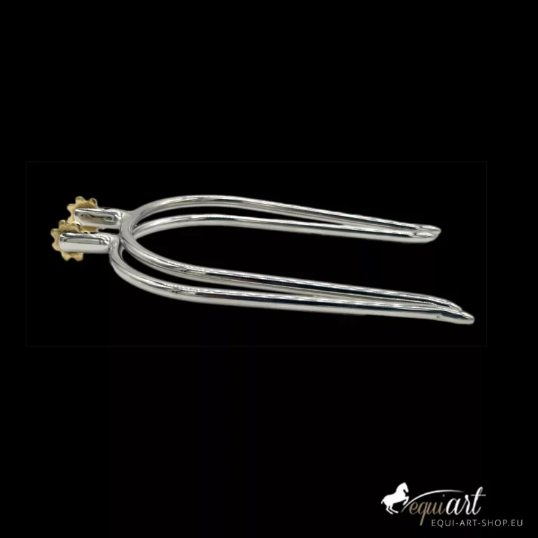 Portugiesische Stecksporen aus Edelstahl mit gezacktem Rad. Der Sporen ist silber, das Rad in messing. Nur solange der Vorrat reicht.