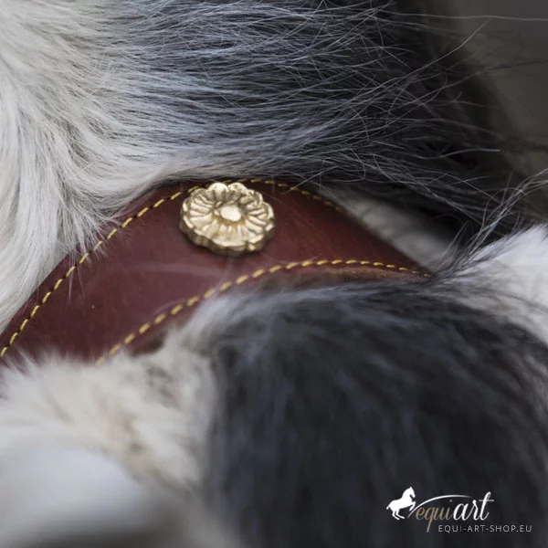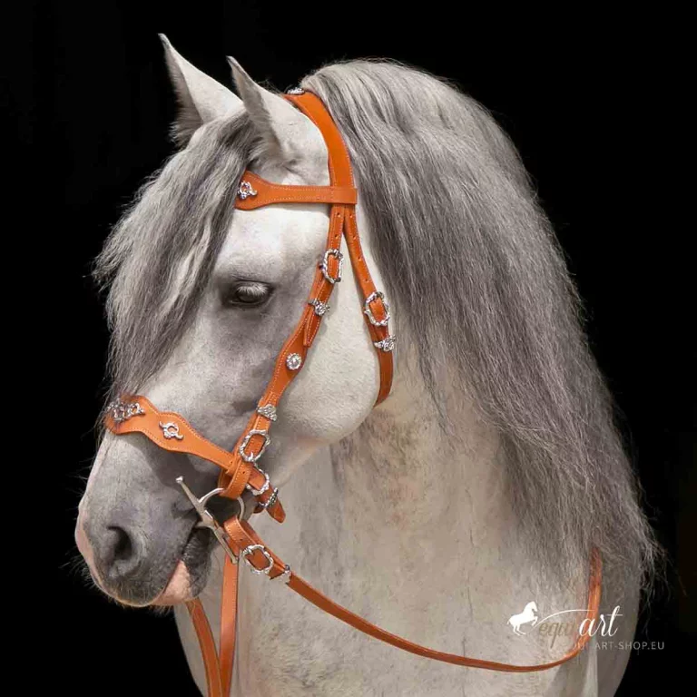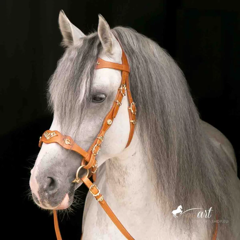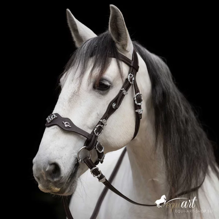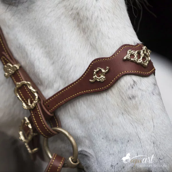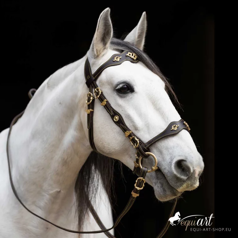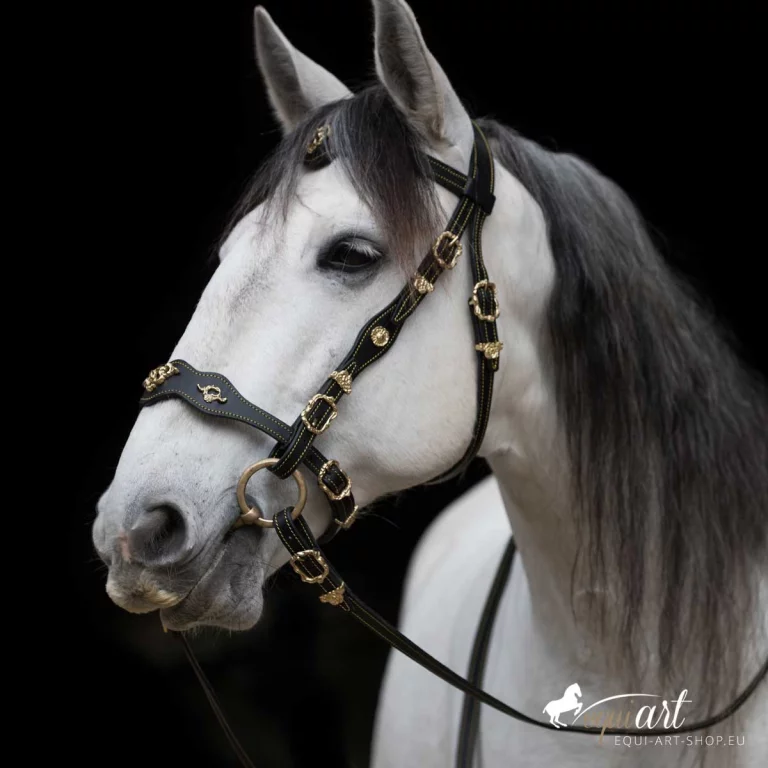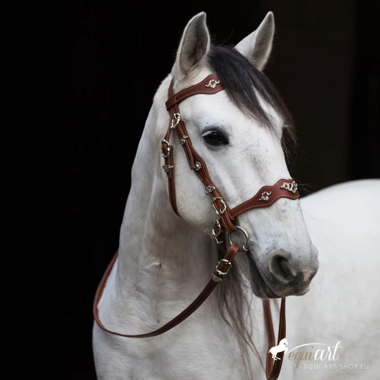 Aufwendiger, barocker Trensenzaum aus bestem Leder mit wunderschönen Detailverarbeitungen. Dieser portugiesische Barockzaum hat geschwungene Nasen und Stirnriemen, die etwas breiter angelegt sind. Der gesamte Zaum ist mit gelben (bei messing Beschlägen) oder weißer (bei silbernen Beschlägen) Ziernähten versehen. Portugiesische Schmuckschnallen, wie prunkvolle Metallpunzierungen auf Stirnriemen, Nasenriemen, Genickstück und Backenstück veredeln diesen iberischen Zaum. Passend dazu sind die Zügel ebenfalls mit Schmuckschnallen und Ziernähten versehen.